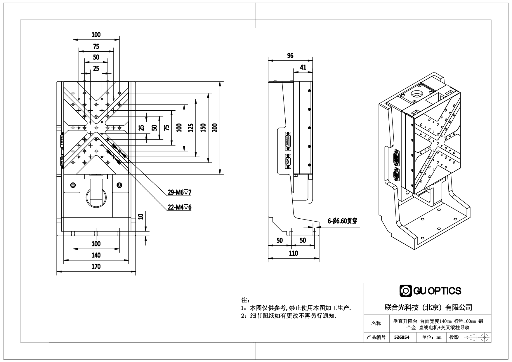 垂直升降台 台面宽度140mm 行程100mm 铝合金 直线电机+交叉滚柱导轨