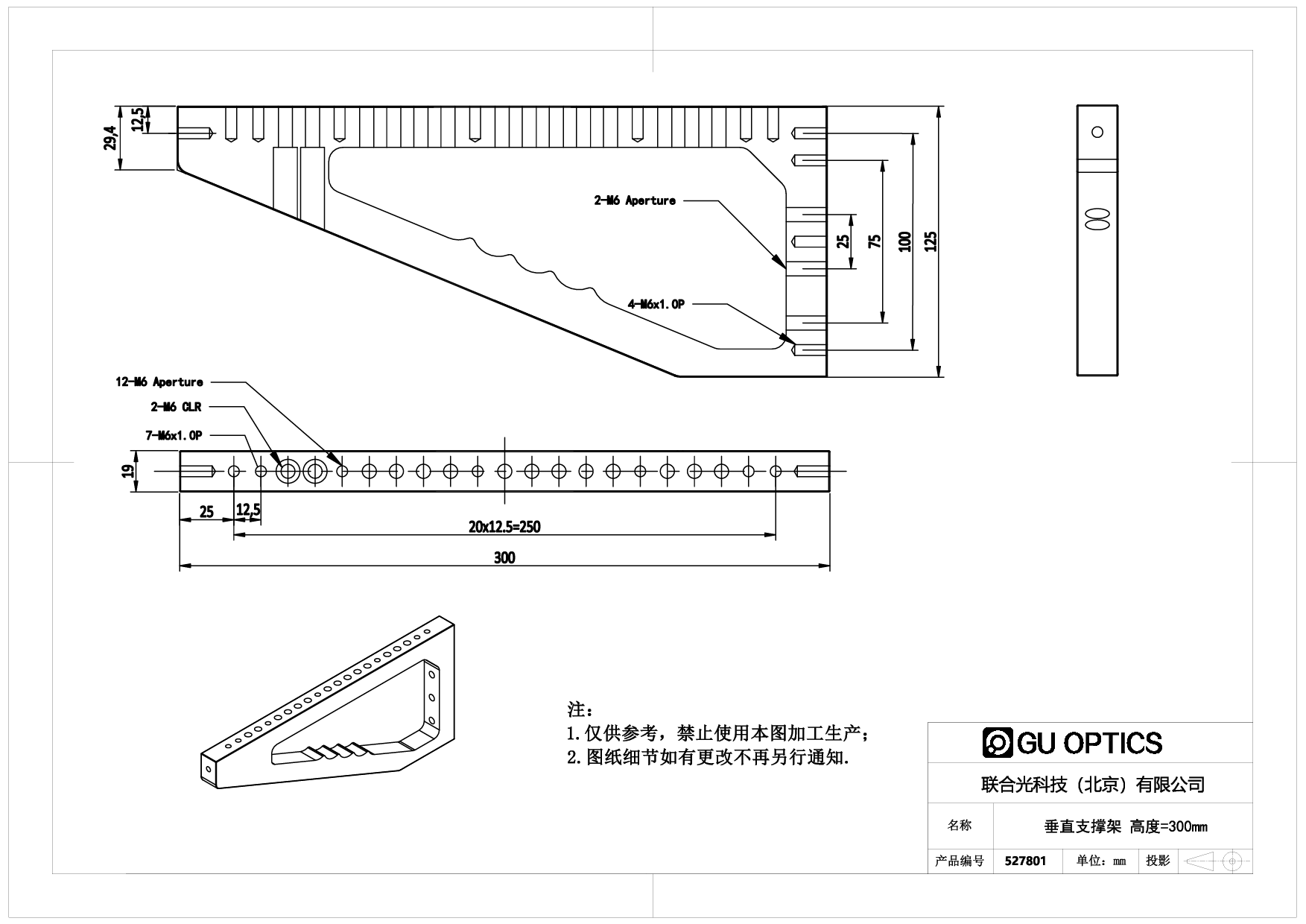 面包板垂直支架(Vertical Support)用于将面包板垂直安装到光学平台上。直角边带M6腰型安装槽(长度分别为150 mm、300 mm),极大地增加了安装灵活性。