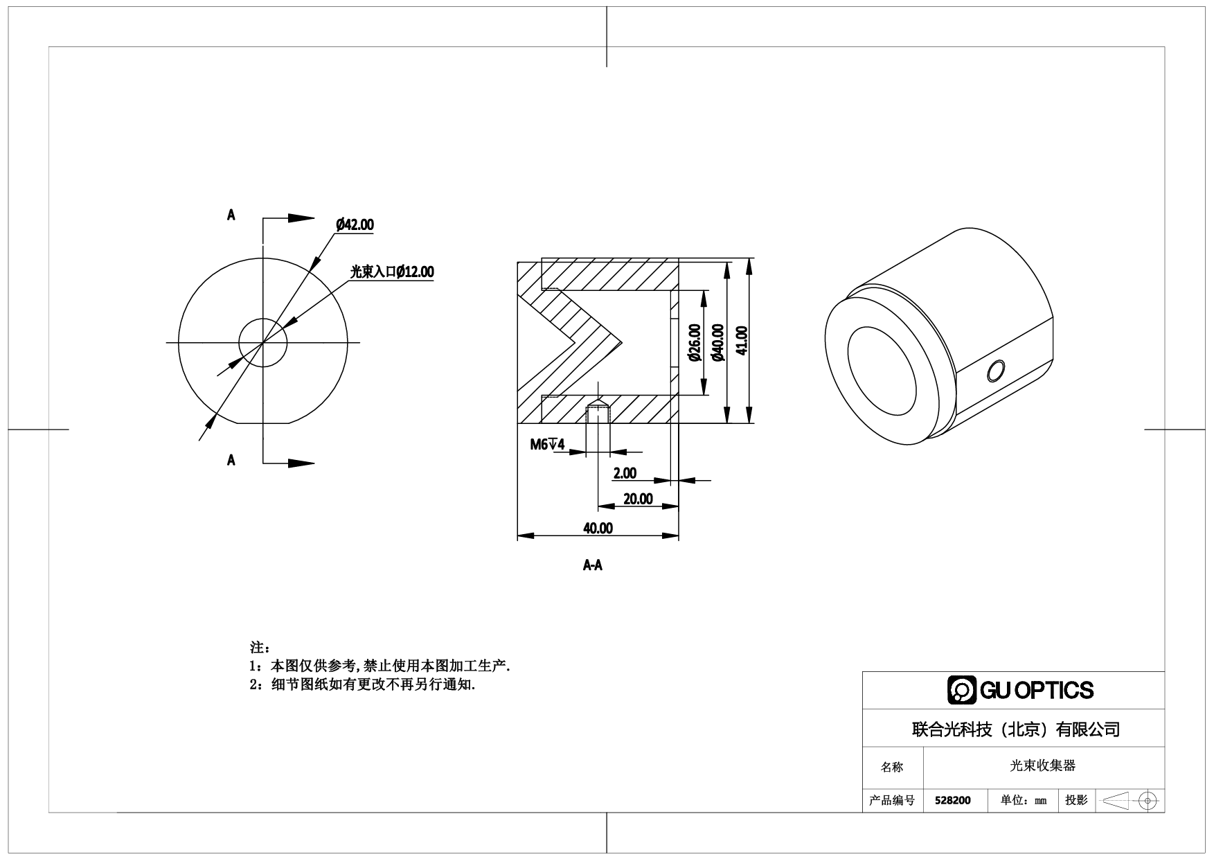 联合光科的光束收集器提供光束入口直径12mm和52mm的两种规格,用于收集光路尾端多余激光和能量,避免尾光造成的伤害,光束收集器的底端带有M6的螺孔,便于连接支撑棒固定在光学平板上。