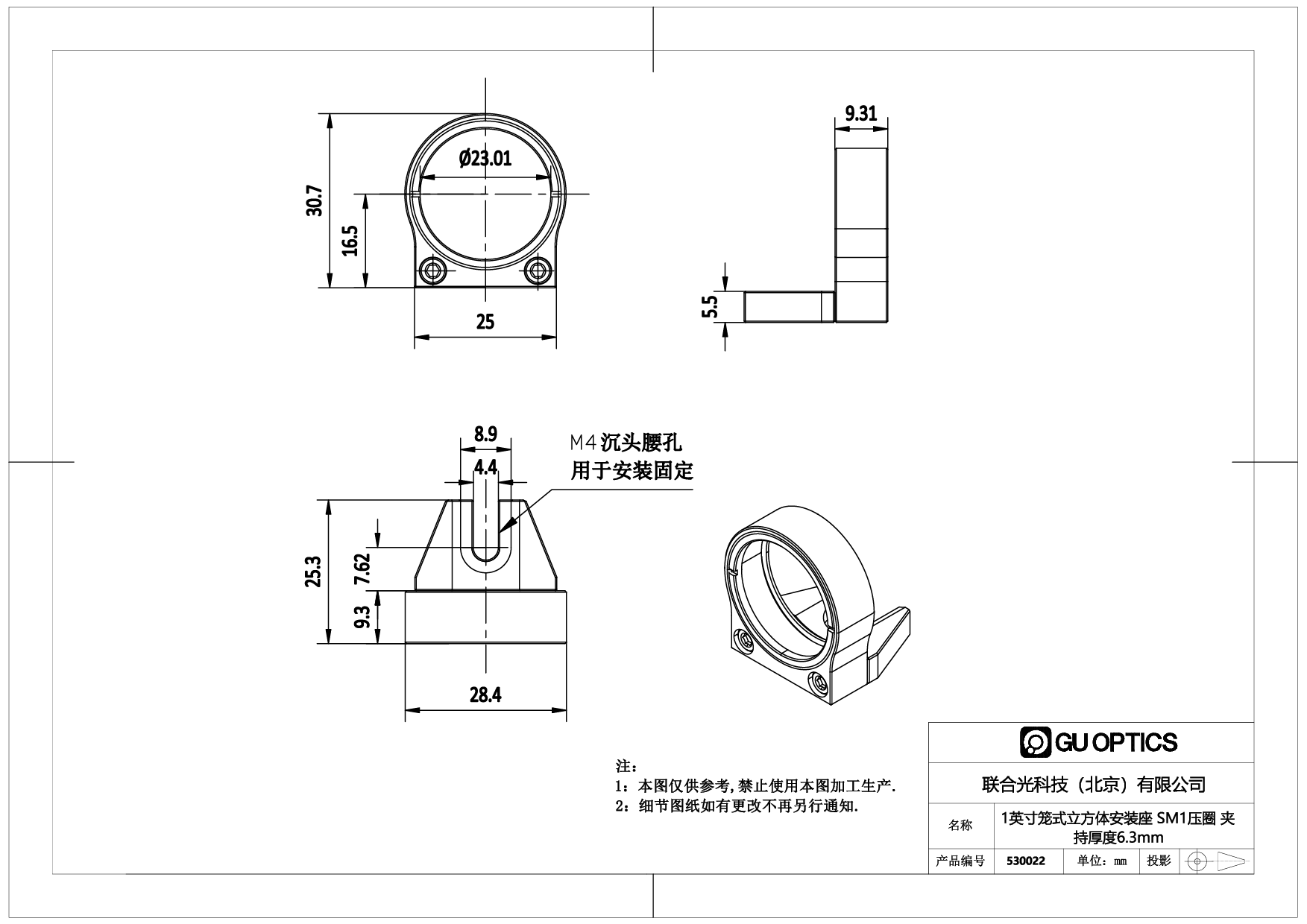 1. 530020安装厚度大于3.0mm的Φ1英寸光学元件;