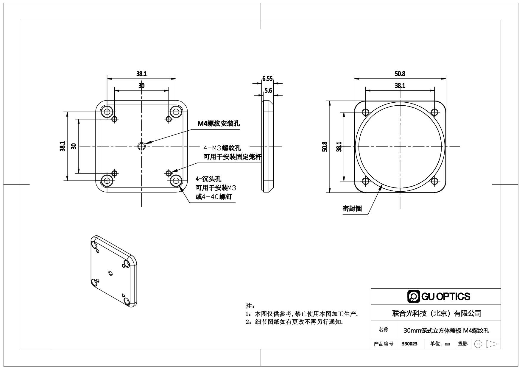 立方体盖板提供SM1螺纹贯穿孔和M4螺纹孔两种类型,兼容30mm笼式系统。配合530012或530013一起使用可以组合为四面、五面或六面SM1螺纹贯穿孔笼式立方体。