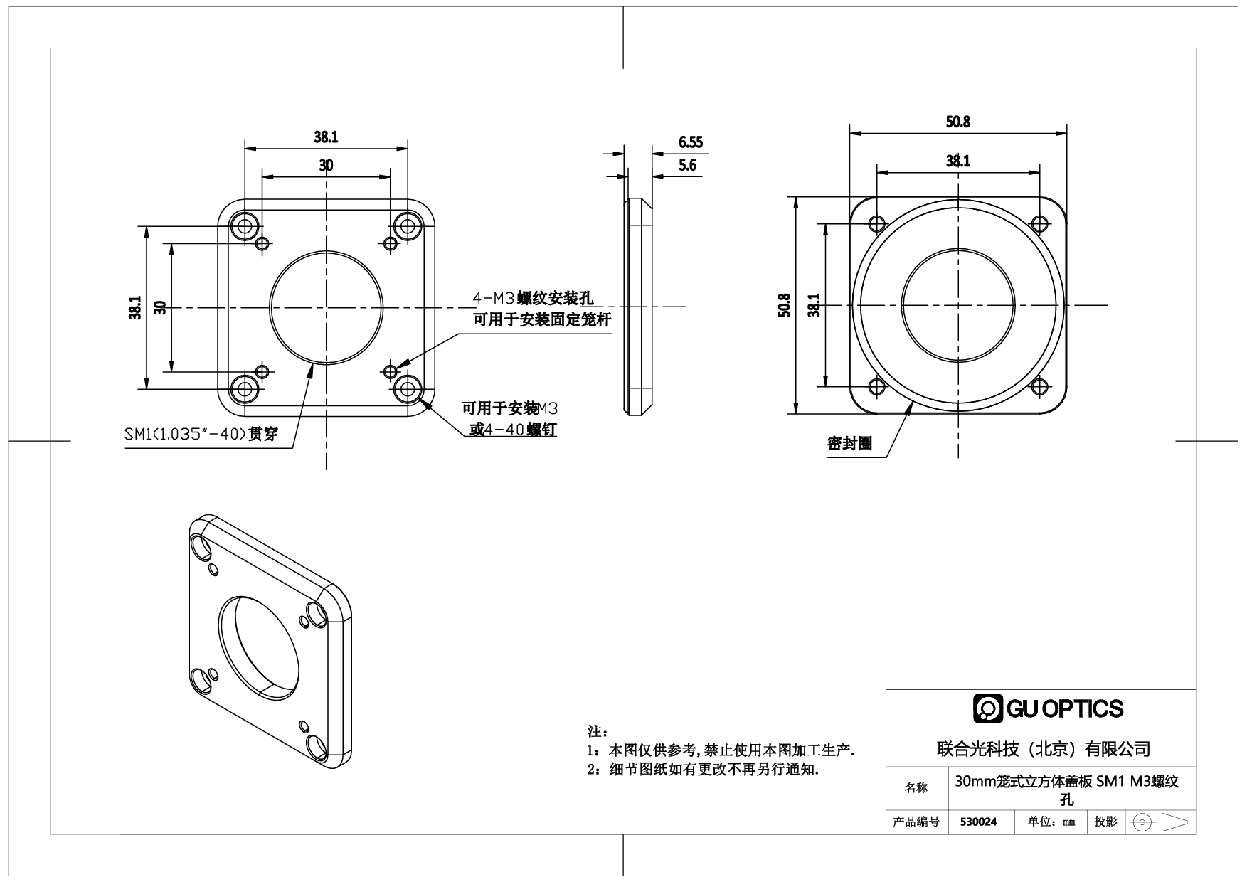 立方体盖板提供SM1螺纹贯穿孔和M4螺纹孔两种类型,兼容30mm笼式系统。配合530012或530013一起使用可以组合为四面、五面或六面SM1螺纹贯穿孔笼式立方体。