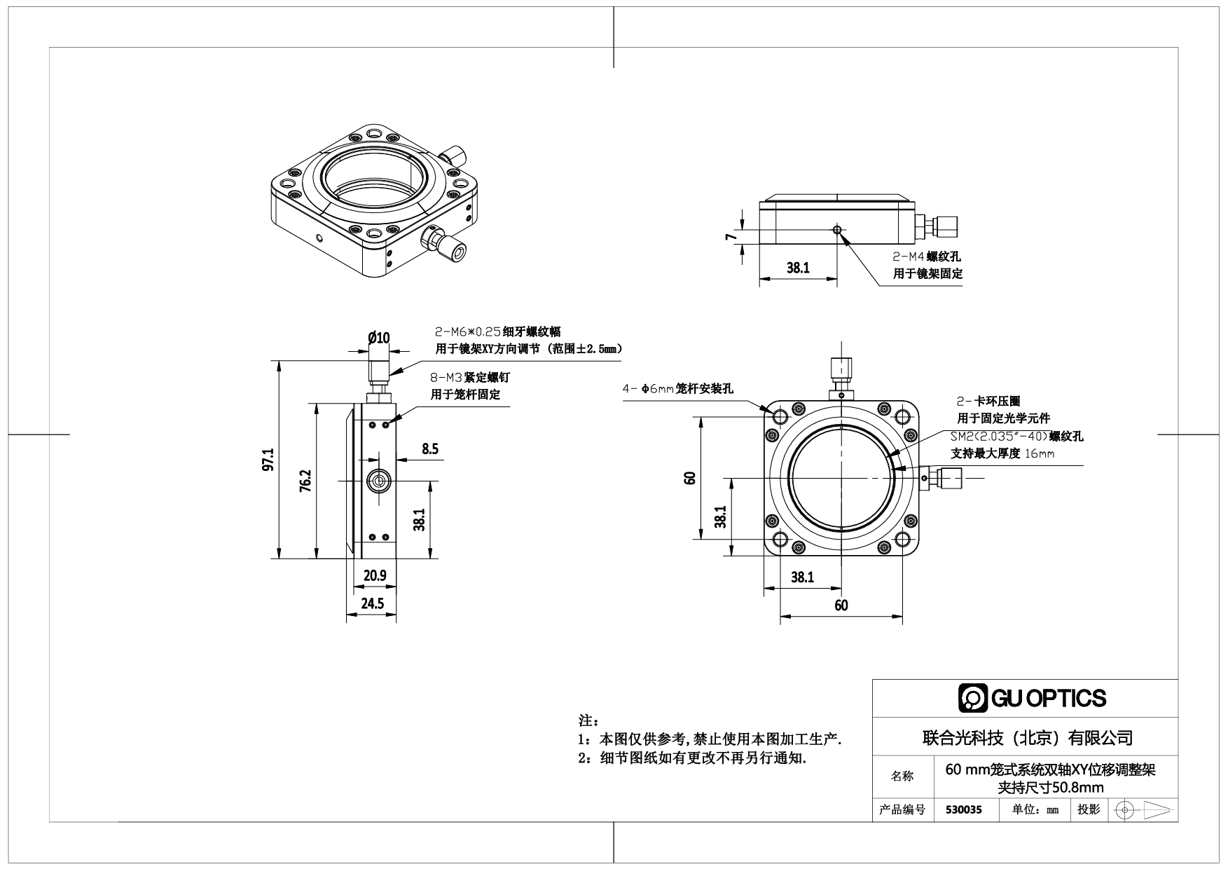 3. 530035适用60mm笼式系统安装,SM2内螺纹,安装Φ50.8mm光学元件,附带1个SM2压圈(530086),固定最大厚度10mm光学元件