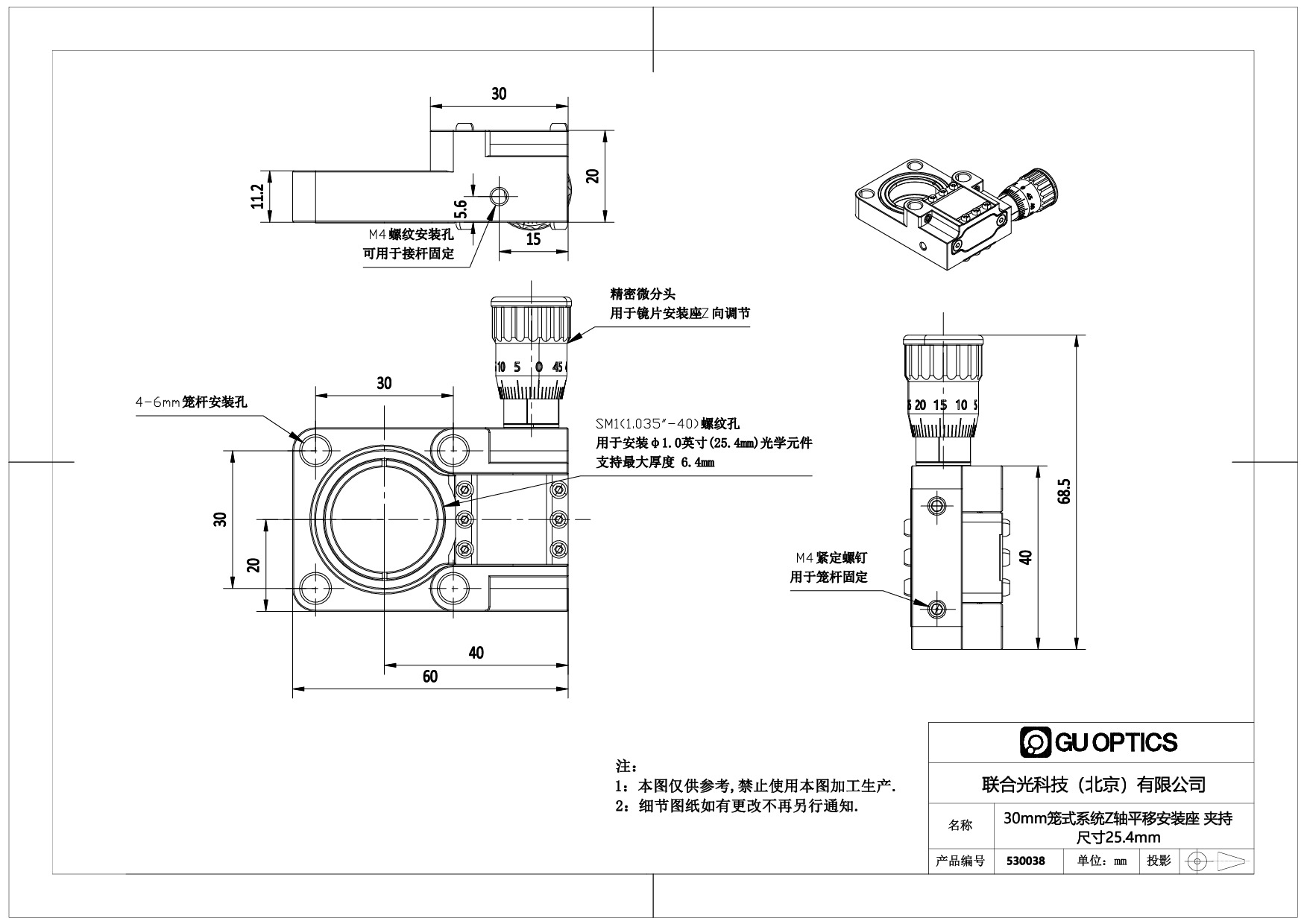 联合光科的Z轴笼式平移安装座适用于30mm笼式系统,通过压圈(附带两个SM1压圈)固定的方式,可安装最大厚度为6.4mm的Φ1英寸光学元件。Z轴笼式平移安装座的挠性设计增加了稳定性。产品可调行程1.0 mm,带行程范围刻度标识。联合光科光学笼式系统的性价比高,组装、移动顺畅,刚性好,为您提供调整、定位、倾斜安装等各类组件,便于调整光路。