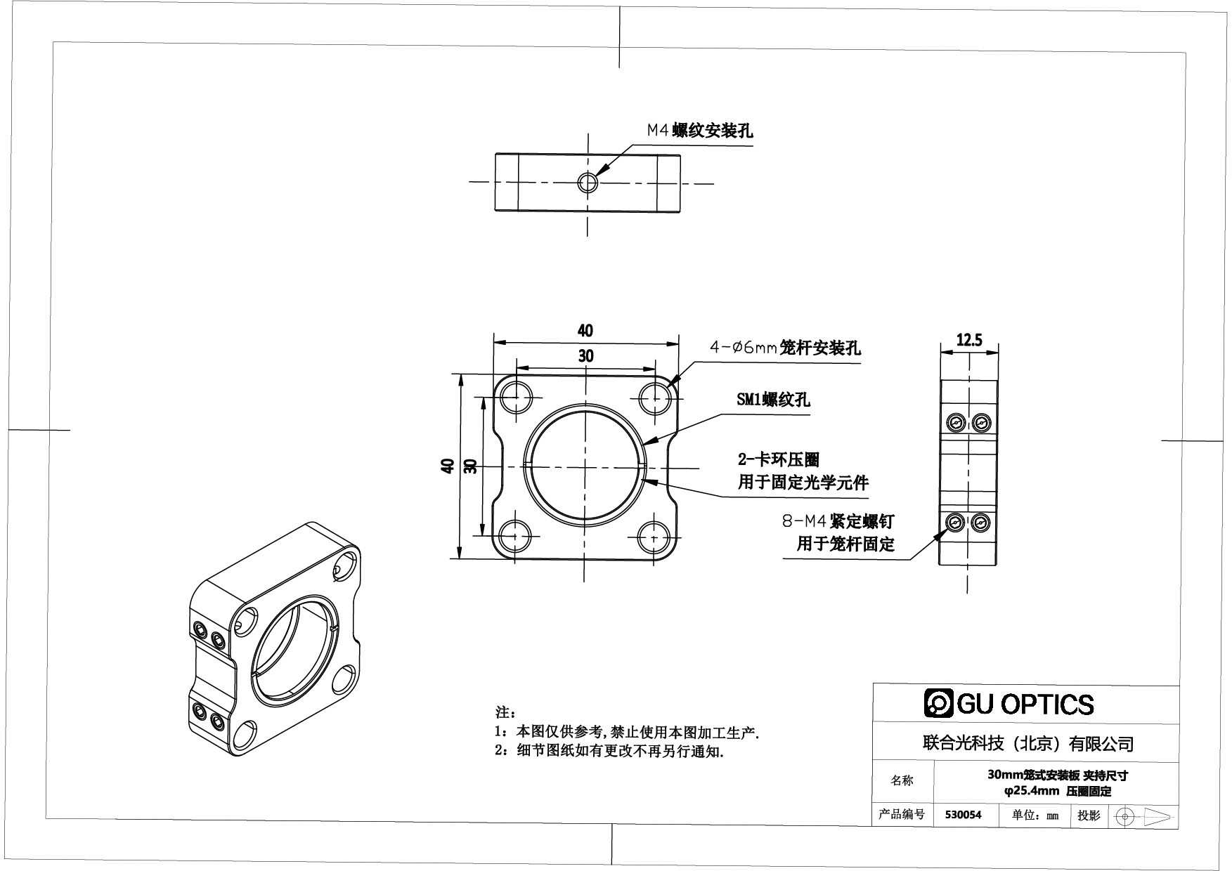 联合光科提供多种规格笼式系统安装板,适用安装12.7mm,Φ25.4mm的光学元件或者透镜套筒物镜等器件,兼容30mm笼式系统。