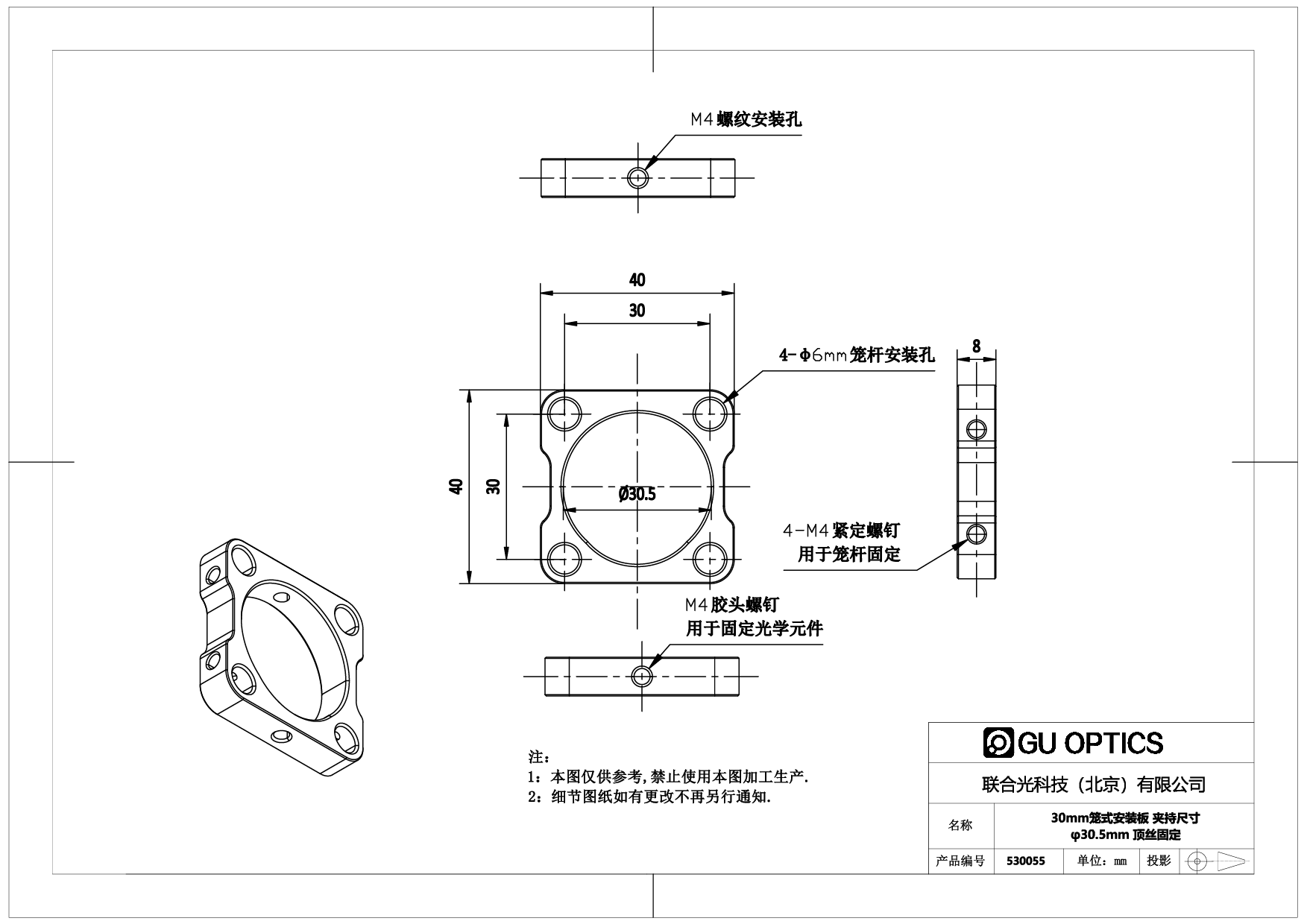 联合光科提供多种规格笼式系统安装板,适用安装12.7mm,Φ25.4mm的光学元件或者透镜套筒物镜等器件,兼容30mm笼式系统。