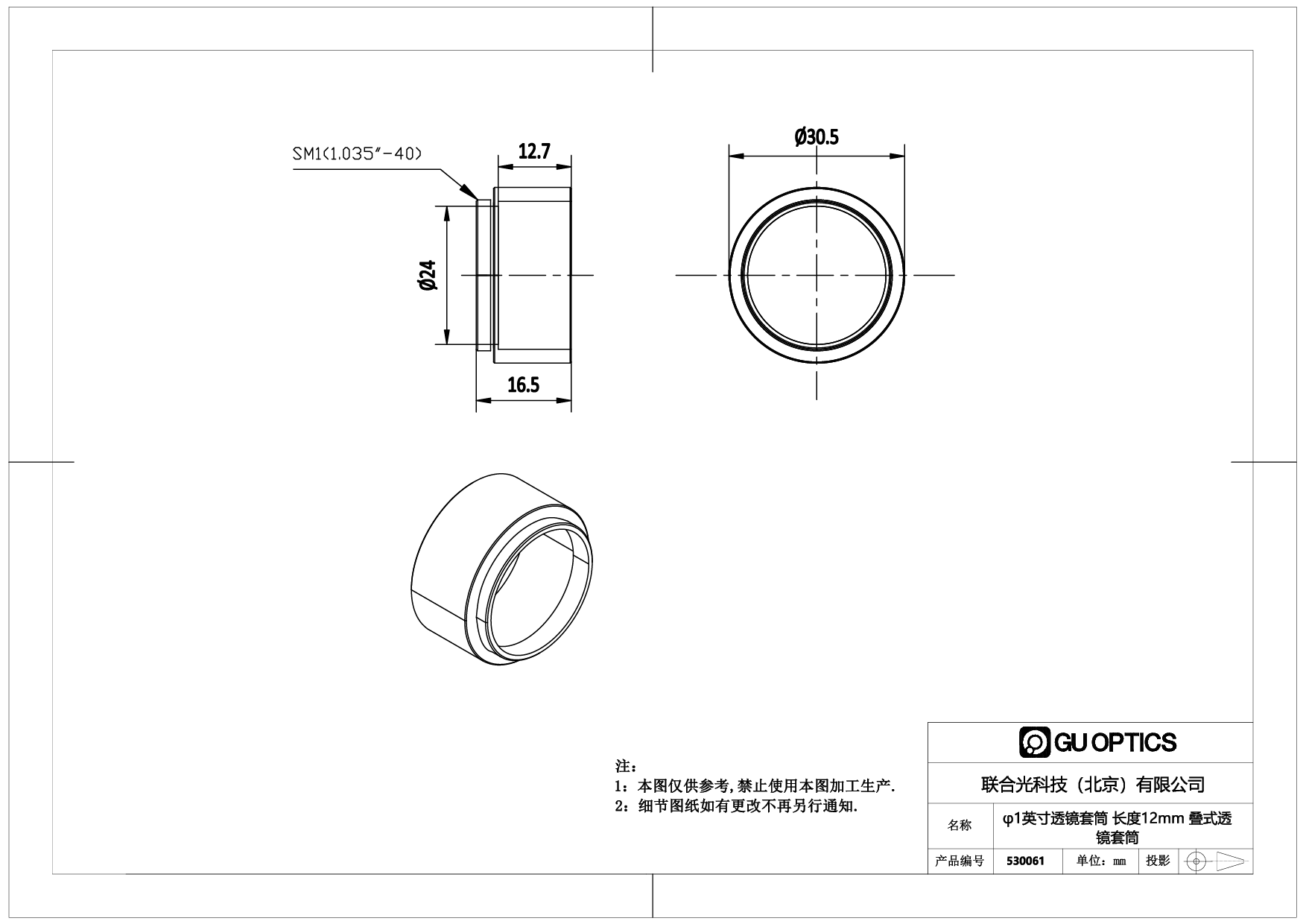 φ1英寸透镜套筒 长度12mm 叠式透镜套筒