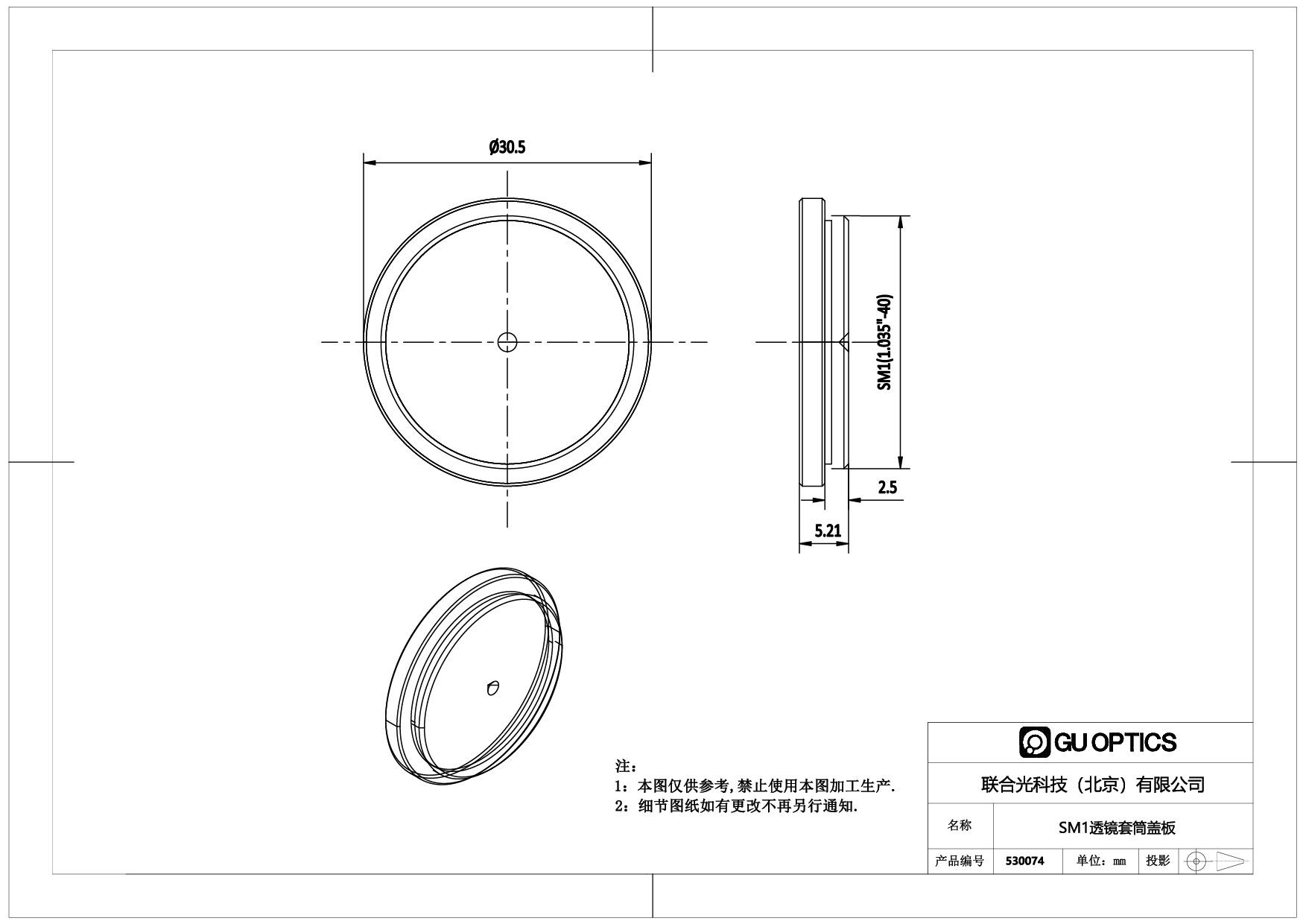 SM1螺纹保护盖,有530075内螺纹保护端盖和530074外螺纹保护端盖两种。前者有SM1内螺纹,可拧在带有SM1外螺纹机械件末端;后者有SM1外螺纹,可拧在带有SM1内螺纹末端,保护光学元件,防尘和遮光作用。