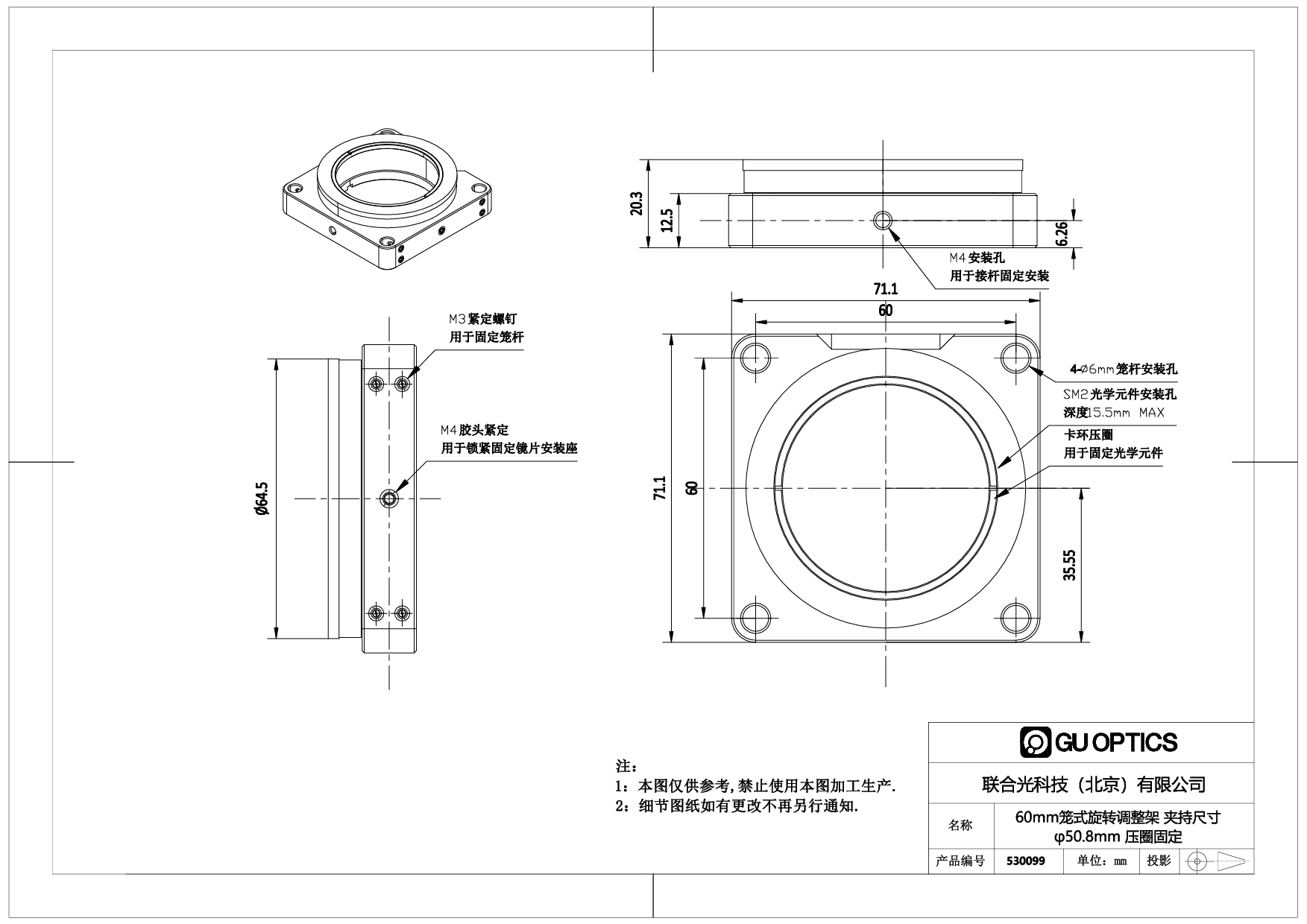 2. 光学元件固定方式:附带2个SM2压圈(530083);