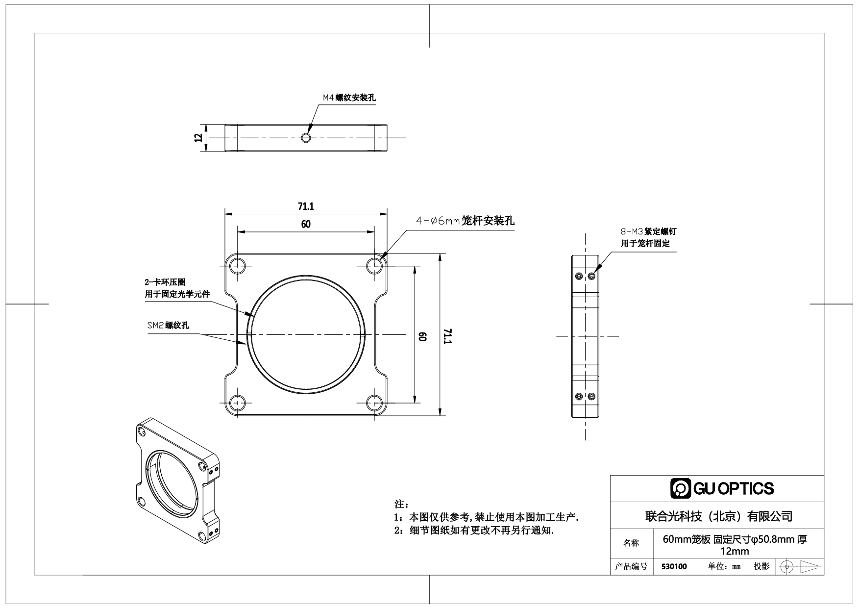 联合光科的60mm笼式系统安装板适用于Φ50.8mm的光学元件,兼容60mm的笼式系统。笼式组装系统提供了一种便捷方法,使用精密加工的构造模块系列产品来构建大型光机械系统,实现高灵活性和精确对准。60 mm笼式系统安装板为在笼式系统中安装之境Φ50.8mm光学元件提供了方法。每块笼板具有四个Φ6 mm通孔,用于60 mm笼杆。联合光科光学笼式系统的性价比高,组装、移动顺畅,刚性好,为您提供调整、定位、倾斜安装等各类组件,便于调整光路。